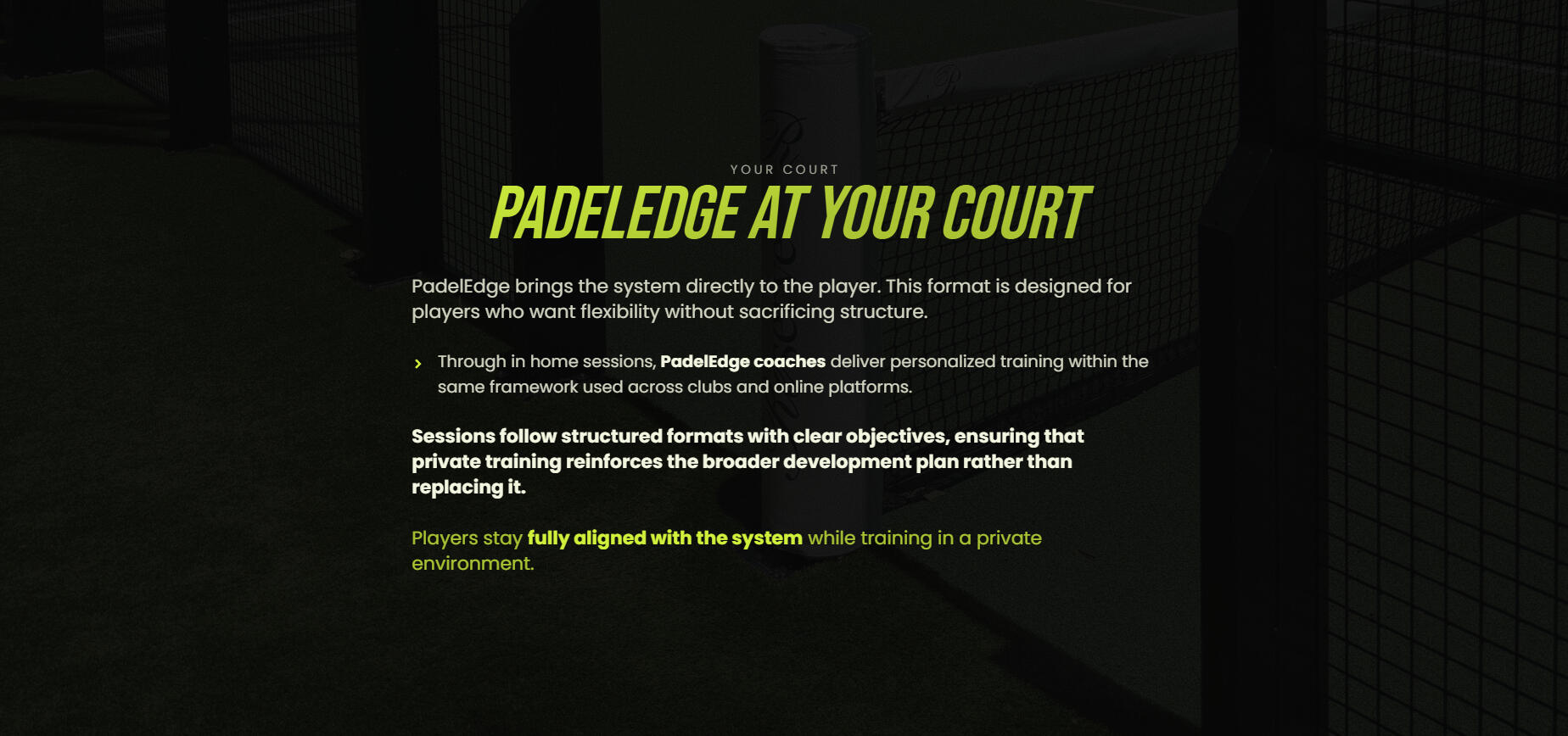 PadelEdge es un proyecto internacional con base en Miami que ayuda a jugadores de pádel a entender y mejorar su juego a través de una metodología clara y estructurada. La web debía reflejar esa misma filosofía: claridad, cercanía y profesionalidad.El proyecto se desarrolló desde cero, creando una identidad visual y una web alineadas con las necesidades y visión de la marca, buscando una experiencia sencilla e intuitiva para usuarios de distintos países.Para este proyecto se trabajó con el paquete Brand Web:
